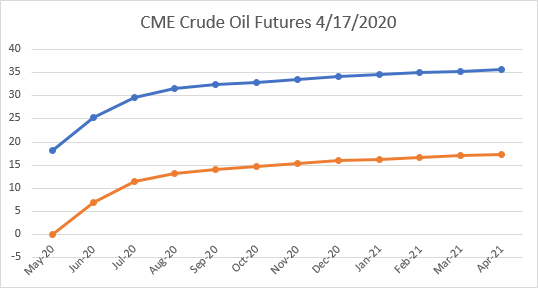 Au moment où nous écrivons ces lignes, le prix au comptant du brut léger non corrosif était de 18,25 dollars. Sur le CME, l’écart entre les prix à terme allant de zéro à un mois jusqu’à plus de 15 $ à sept mois. Graphiquement, nous voyons les prix à terme en bleu, avec l’écart entre les prix au comptant en dessous, en orange.