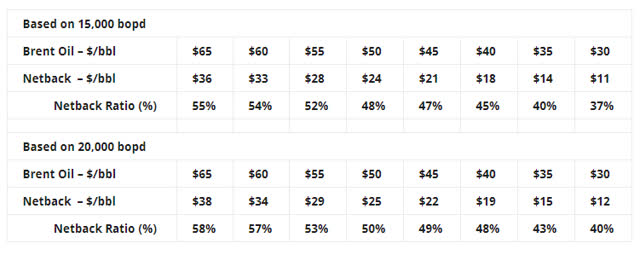 Il y a encore beaucoup d’incertitude car bien que PetroTal ait essayé de rassurer le marché avec son tableau de sensibilité (voir ci-dessous), il sera bon de voir les résultats financiers réels. PetroTal a également promis de devenir un payeur de dividendes avec un rendement de 4 % basé sur la capitalisation boursière de la société – une étrange politique de dividende car je préférerais qu’un dividende soit basé sur les bénéfices et le cash-flow plutôt que sur la capitalisation boursière. Un premier dividende de 0,0017 $CAN a été versé en janvier, et PetroTal semble donc prendre son engagement de dividende au sérieux. Cela étant dit, les investisseurs en dividendes devraient probablement rester réalistes pour 2020 car la priorité devrait être de maintenir un bilan sain plutôt que de verser un dividende et la suspension du versement de dividendes annoncée le 21 avril est une mesure que je soutiens.