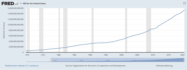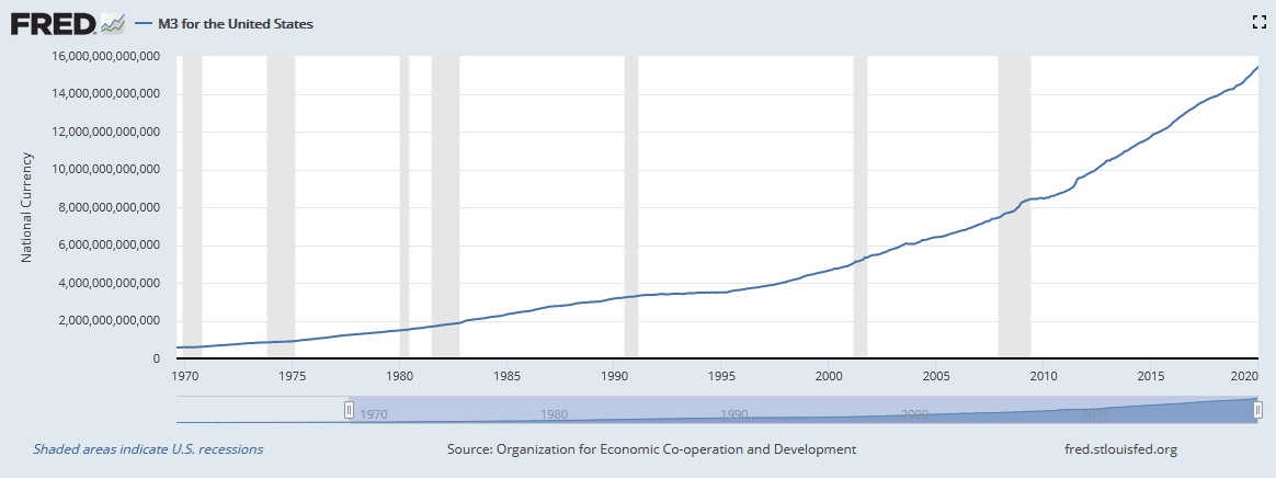 Comme certains lecteurs le savent, le dollar américain était soutenu par de l’or jusqu’en 1971, lorsque le président Richard Nixon a mis fin à la convertibilité du dollar américain en or. Cette décision était en partie due à la compétitivité croissante des économies européenne et japonaise, qui a entraîné un déficit commercial croissant aux États-Unis et une ruée sur les stocks d’or américains, les étrangers commençant à convertir leurs dollars en or. La Réserve fédérale avait une capacité très limitée à défendre la valeur du dollar et des réserves d’or en raison du taux de change fixe entre le dollar et l’or. En outre, il est possible que les États-Unis aient voulu imprimer de l’argent pour aider à payer les dépenses de la guerre du Vietnam. La Réserve fédérale a profité de cette nouvelle opportunité et n’a cessé d’augmenter la masse monétaire depuis les années 1970. Nous pouvons le constater ici :