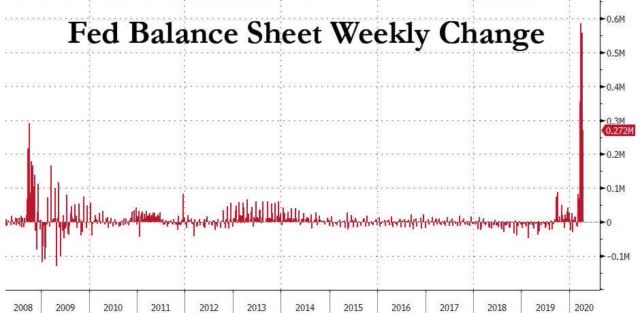 Mark Cabana, l’un des stratèges de la Bank of America en ce qui concerne la Réserve fédérale, s’attend à ce que ce chiffre dépasse les 9 billions de dollars d’ici la fin de l’année. S’il a raison, cela signifie que la Réserve fédérale va monétiser toute la dette émise par le gouvernement fédéral cette année, y compris le plan de relance de plusieurs billions de dollars récemment approuvé en réponse à la pandémie de coronavirus. Il y a plusieurs dispositions de ce projet de loi qui feront que l’argent entrera effectivement dans l’économie réelle, y compris les paiements directs aux particuliers, les prêts aux entreprises qui finissent par être annulés si l’argent est utilisé pour maintenir les gens au travail, les renflouements directs aux entreprises en difficulté, et d’autres choses. En attendant, il semble certain que l’économie au sens large va se contracter cette année en raison des fermetures généralisées destinées à arrêter la propagation du virus et de toutes les personnes sans emploi qui ne pourront pas dépenser de l’argent même si cela était possible.
