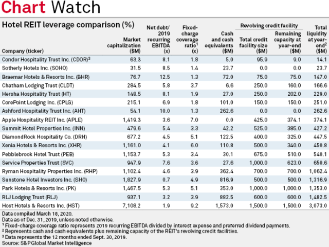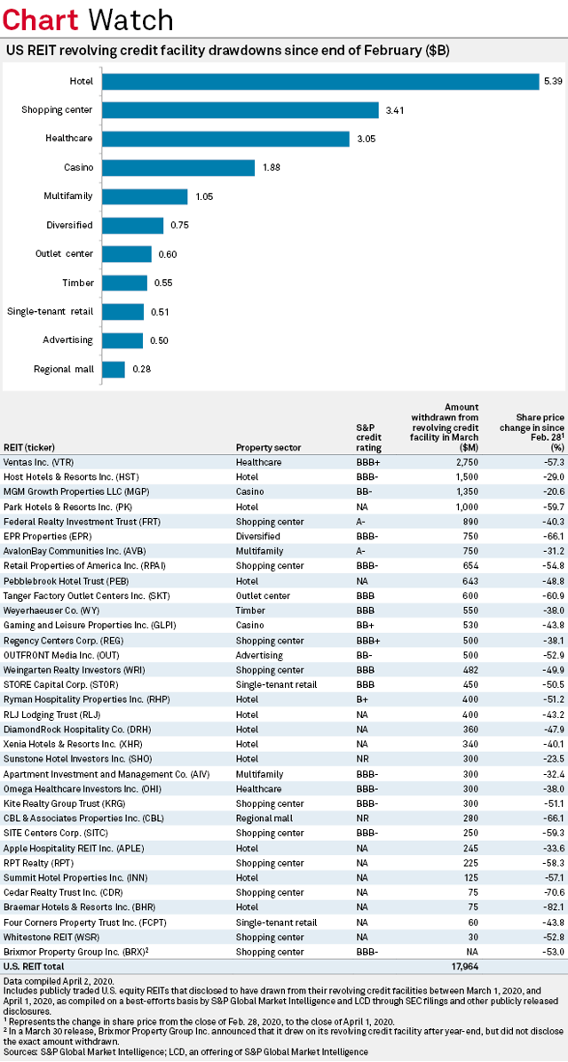 De nombreuses sociétés de placement immobilier ont prélevé de manière préventive une partie ou la totalité de la capacité de leurs lignes de crédit afin de s’assurer qu’elles disposeront de plus de liquidités pendant cette récession. En raison de la crise d’une gravité disproportionnée à laquelle le secteur de l’hôtellerie est confronté, les sociétés de placement immobilier du secteur hôtelier ont utilisé leurs facilités de crédit renouvelables de manière plus agressive que les sociétés de placement immobilier de tout autre type de propriété.