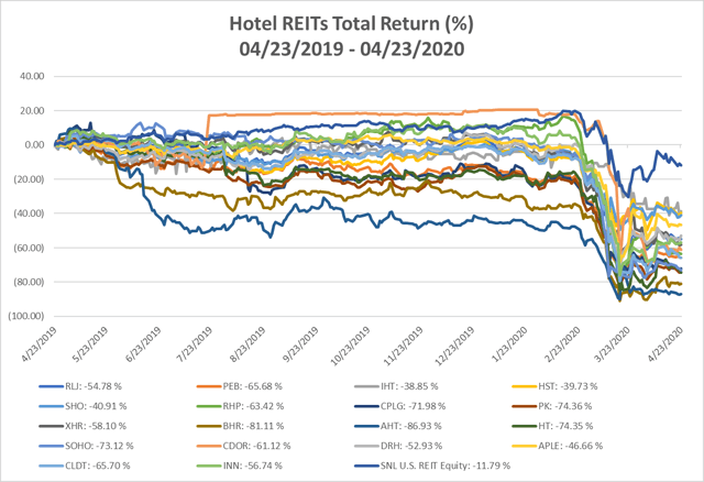 Le secteur des REIT hôteliers (-61,47%) a réalisé un rendement total moyen plus de 5 fois inférieur à celui de l’indice SNL des REIT américains (-11,79%) au cours de l’année dernière. Toutes les sociétés de placement immobilier hôtelier ont enregistré des performances très inférieures à celles du secteur dans son ensemble. Les FPI hôtelières qui ont subi les plus petites pertes sont InnSuites Hospitality Trust avec -38,85 %, Host Hotels & Resorts avec -39,73 % et Sunstone Hotel Investors avec -40,91 %. Les FPI hôtelières les moins performantes ont été Ashford Hospitality Trust avec -86,93 %, Braemar Hotels & Resorts avec -81,11 % et Park Hotels & Resorts (NYSE:PK) avec -74,36 %.
