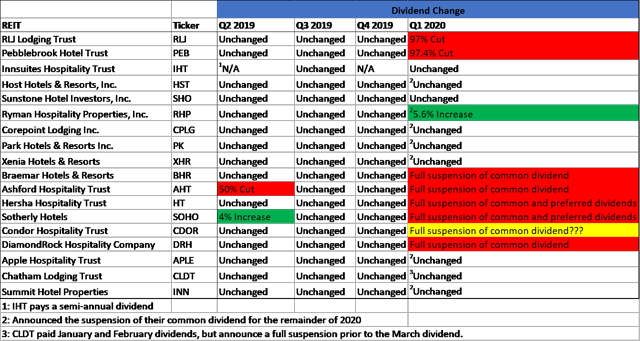 Avant la COVID-19, chaque société de placement immobilier du secteur hôtelier versait un dividende commun. Deux sociétés de placement immobilier du secteur hôtelier, Ryman Hospitality Properties (RHP) et Sotherly Hotels, ont augmenté leur dividende l’année dernière, mais toutes deux ont maintenant annoncé que leur dividende est suspendu à l’avenir. RLJ Lodging Trust (RLJ) et Pebblebrook Hotel Trust ont tous deux réduit leurs dividendes du premier trimestre de 97 %, à 0,01 $. InnSuites Hospitality Trust, qui verse un dividende semestriel, a versé un dividende complet au premier trimestre et n’a pas encore annoncé comment le dividende sera traité au troisième trimestre. Au total, 12 FPI hôtelières ont versé un dividende au premier trimestre 2020, alors que 6 avaient déjà suspendu leur dividende. En raison des baisses dévastatrices du RevPAR dans l’industrie hôtelière, 15 des 18 FPI hôtelières ont maintenant annoncé que leurs dividendes ordinaires seront suspendus au moins jusqu’à la fin de 2020. Hersha Hospitality Trust (HT) et Sotherly Hotels sont allés encore plus loin en suspendant également les dividendes sur leurs actions privilégiées.