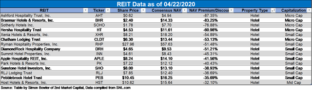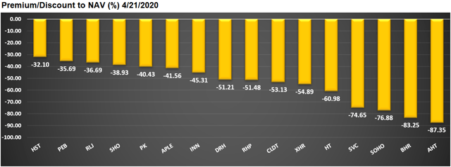 La prime ou la décote de consensus des analystes par rapport à la valeur d’actif net est représentée dans un graphique à barres ci-dessus et dans un tableau de données ci-dessous (le tableau de données comprend des informations supplémentaires). Il n’existe actuellement pas de valeur liquidative consensuelle pour le Condor Hospitality Trust (CDOR), le CorePoint Lodging (CPLG) ou l’InnSuites Hospitality Trust (IHT), qui ont donc été exclus du graphique ci-dessus et du tableau ci-dessous.