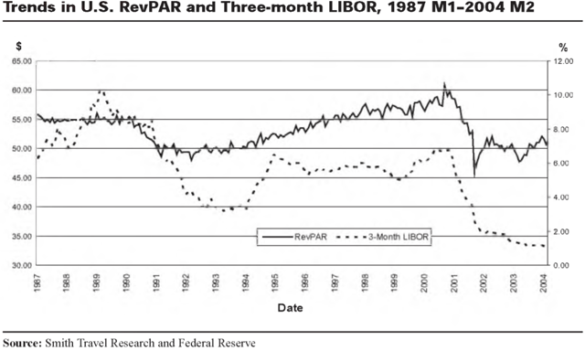 Une autre différence essentielle est la structure des prêts. La plupart des flux de trésorerie locatifs que reçoivent les sociétés de placement immobilier proviennent de baux pluriannuels à loyer fixe ou à indexation modeste des loyers. Il en résulte que les revenus futurs de chaque propriété sont largement prévisibles et stables. Les FPI préfèrent généralement financer ces biens avec des dettes à taux fixe, ce qui se traduit par un écart relativement constant dans le temps entre le taux plafond d’acquisition du bien (ou taux plafond de développement) et le taux d’intérêt sur la dette utilisée pour le financer. Les hôtels, en revanche, préfèrent généralement utiliser une dette à taux variable. Cela est dû au fait que les taux d’intérêt augmentent généralement dans une bonne économie (lorsque les hôtels connaissent généralement une hausse du RevPAR) et diminuent lorsque l’économie s’affaiblit (lorsque le RevPAR des hôtels est en baisse). Des recherches ont démontré que les revenus des hôtels et le LIBOR sont fortement et significativement corrélés. Compte tenu du caractère cyclique des flux de trésorerie des sociétés de placement immobilier hôtelières, cela signifie que les taux d’intérêt augmentent généralement à un moment où les hôtels peuvent se permettre de payer les taux plus élevés et diminuent pendant les périodes où ces sociétés de placement immobilier ont besoin que le coût de leur dette diminue. Ce meilleur alignement des flux de trésorerie d’exploitation et des obligations de service de la dette peut aider les sociétés de placement immobilier hôtelières à mieux gérer leurs difficultés financières.