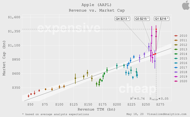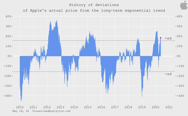 Comme vous pouvez le constater, la capitalisation actuelle d’Apple est supérieure d’environ 50 % au niveau d’équilibre dans les limites de ce modèle. Ce chiffre est proche du maximum atteint au cours des dix dernières années.