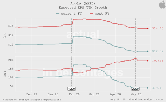 Après le dernier rapport, les attentes moyennes des analystes concernant la croissance du chiffre d’affaires et du BPA d’Apple pour l’exercice en cours et le prochain exercice n’ont pas beaucoup changé. Notez que pour cet exercice, on ne prévoit pratiquement pas de croissance des recettes :