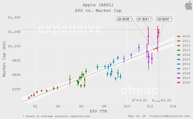 Compte tenu de la relation à long terme entre la taille absolue du BPA TTM et la capitalisation de l’entreprise, le prix actuel d’Apple est également surévalué :