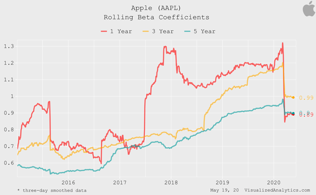 La bêta d’Apple est maintenant proche de 0,9. Cela signifie qu’une augmentation/diminution de S&P 500 à 1 % s’accompagnera d’une augmentation/diminution moyenne du cours de l’action de la société à 0,9 %. En d’autres termes, Apple est toujours très sensible à la dynamique du marché dans son ensemble.