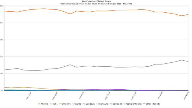 Eh bien, tout d’abord, nous savons que la part mondiale du système d’exploitation mobile iOS a diminué en avril pour la première fois depuis 2018 :
