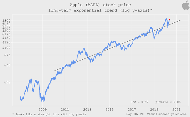 Depuis 2014, le cours de l’action Apple (NASDAQ:AAPL) suit sa tendance exponentielle à long terme :