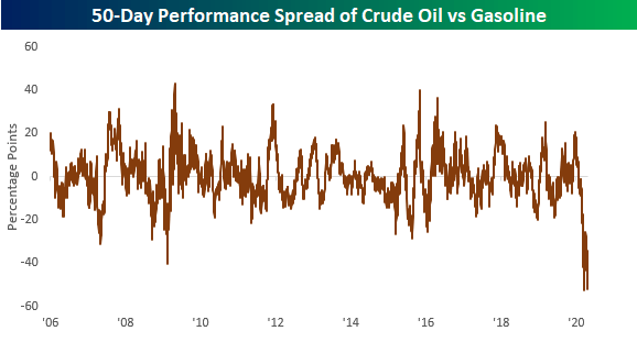 Une autre façon d’illustrer cela est de comparer la performance du pétrole brut par rapport aux prix moyens à la pompe au cours des 50 derniers jours de négociation. Au cours de cette période, les prix WTI du premier mois ont baissé de 78 %, tandis que les prix moyens à la pompe ont baissé de moins d’un tiers, soit 25,6 %. Avec un écart de plus de 50 points de pourcentage, l’écart de performance entre les deux n’a jamais été aussi important.