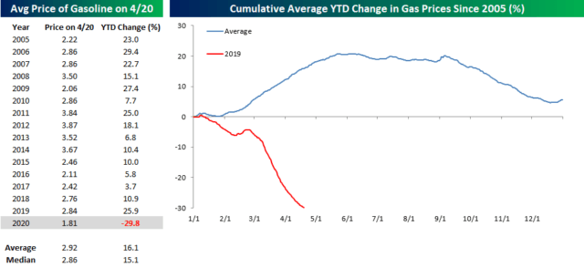 Si les prix du gaz sont naturellement plus bas depuis le début de l’année, ces baisses sont intervenues à un moment où les prix n’ont cessé d’augmenter. Si l’on remonte à 2005, c’est la première année où le prix moyen de l’essence a été inférieur à 2 dollars le gallon à cette époque de l’année. De plus, c’est aussi la première fois que les prix ont baissé sur une base annuelle jusqu’à 4/20. Normalement, les prix à la pompe sont en hausse de plus de 15 % en cumul annuel à cette période de l’année, mais en raison de la pandémie mondiale, les prix ont baissé de près de 30 % cette année. Maintenant, si seulement les consommateurs avaient un endroit où aller pour profiter de ces prix anormalement bas !