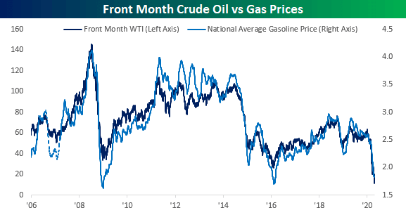 Alors que le pétrole est en plein milieu de ce qui pourrait être la plus forte baisse de son histoire, il n’est pas surprenant de constater que le prix de l’essence à la pompe a également baissé. Le graphique ci-dessous montre que le prix moyen national de l’essence est étroitement lié au prix du pétrole brut, mais si l’on regarde de plus près, les prix à la pompe n’ont pas baissé autant que le prix du pétrole brut. Par exemple, alors que les prix du pétrole brut sont à leur plus bas niveau depuis les années 1990, le prix moyen national du gallon d’essence est toujours supérieur à ce qu’il était en 2016.