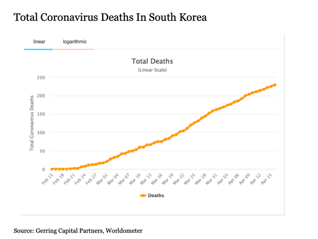 Une fois de plus, si c’est ce qui nous attend, je serai ravi. Mais je considère que c’est un résultat très improbable. Pourquoi ? Parce que je regarde la Corée du Sud, un pays qui a réagi au coronavirus sans doute aussi bien que n’importe quel autre pays du monde.