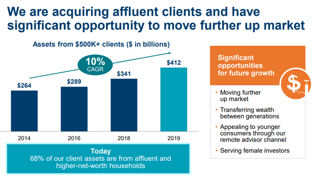 Nous pouvons également nous pencher sur les performances récentes, en 2019. Une fois de plus, les notes sont élevées. L’entreprise s’est emparée d’une clientèle clé, à savoir les clients disposant d’un avoir net de 500 000 dollars.