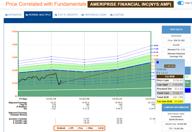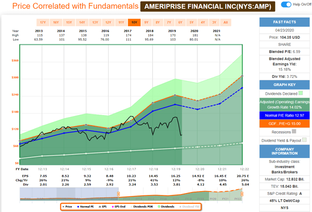 Compte tenu d’une juste valeur de 175 dollars par action, qui est d’ailleurs basée sur un P/E prudent de 11.8 Sur la base des prévisions de bénéfices pour 2020, Ameriprise Financial est actuellement confrontée à une sous-évaluation de 68%.
