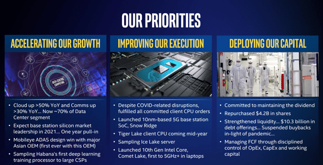 Pourtant, le titre s’est vendu malgré une croissance des revenus de 23% et des prévisions de croissance à deux chiffres pour le deuxième trimestre. Comme nous l’avons vu, les marges brutes du deuxième trimestre sont un peu trompeuses, et Intel a en fait déclaré que le 10nm est en avance sur les prévisions, et qu’il augmente les perspectives de volume du 10nm pour Tiger Lake. En outre, COVID-19 ne devrait pas causer d’entrave du côté des nœuds de processus, ni peser sur les résultats du deuxième trimestre.