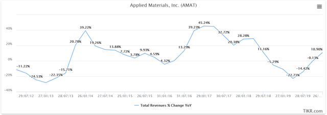 Le timing de la pandémie est malheureux, car l’AMAT semble avoir connu un cycle baissier dès 2019, et venait à peine de commencer à voir la croissance de ses revenus reprendre. La croissance trimestrielle des revenus a atteint un creux de -23 % en avril de l’année dernière, mais a repris au trimestre de janvier 2020 avec une croissance de 11 % par an, comme le montre le graphique suivant :