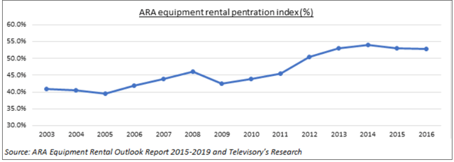 On observe également une tendance séculaire à long terme à la location de matériel. La pénétration de la location de matériel dans le secteur de la construction est passée d’environ 40 % en 2005 à plus de 50 % en 2016. En 2019, elle a atteint près de 57 %.