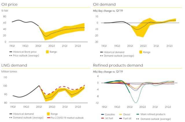 Royal Dutch Shell a connu une baisse des prix sans précédent, ainsi qu’une fourchette de prix pour une reprise. Il convient de noter ici que, dans le cadre de la reprise prévue, les prix devraient à peine dépasser 40 dollars par baril d’ici 2021. Aujourd’hui, le marché sous-estime traditionnellement la force des ralentissements et des reprises, mais la reprise devrait être encore lente.