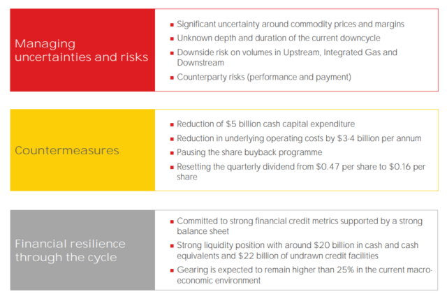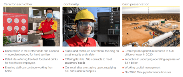 Royal Dutch Shell s’est attachée à soutenir ses employés, à permettre à ceux qui peuvent travailler à domicile de le faire et à aider ceux qui doivent continuer à travailler. Dans le même temps, la société se concentre sur le maintien de la solidité de ses activités, avec des contrats flexibles, et sur les aspects essentiels de ses activités. Ces éléments mis ensemble sont des actions d’entreprise classiques dans un monde COVID-19.