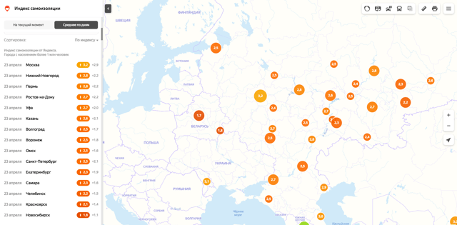 L’indice d’auto-isolement de Yandex (NASDAQ:YNDX) montre à quel point la population respecte les restrictions de mouvement. Plus le niveau est élevé, plus le virus a du mal à se propager. Comme on peut le voir, la majorité des villes russes ont un indice d’auto-isolement inférieur à 3 points sur 5. Un score entre 2 et 3 points signifie qu’il y a beaucoup de gens dehors et un score de 4 à 5 points indique que les rues sont presque vides.