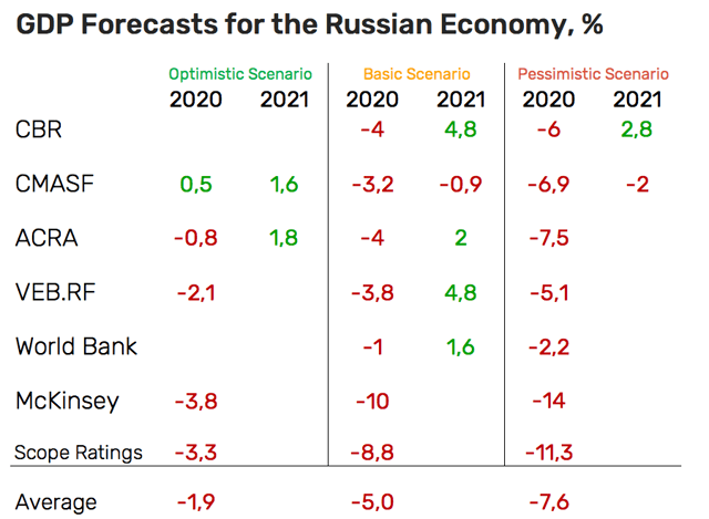 La prévision du PIB de la Banque centrale est généralement conforme aux autres estimations. J’ai regroupé les prévisions pour le PIB russe dans le tableau ci-dessous. À titre de référence, j’ai inclus les estimations du Centre d’analyse macroéconomique et de prévision à court terme (CMASF), organisme indépendant à but non lucratif, ainsi que celles de l’agence de notation d’État ACRA et de la société d’État VEB.RF. Malgré le fait que toutes les sources n’ont pas les trois scénarios et une perspective pour 2021, je pense que le tableau serait tout de même très utile aux lecteurs pour comprendre l’ampleur des estimations.
