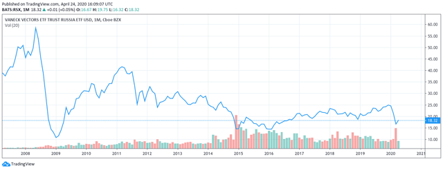 RSX a généralement une vue tactique à court terme ici sur SA, mais mon exception prouve la règle : vous devez agir tactiquement avec RSX. Le graphique du prix du RSX sur 12 ans montre clairement qu’investir sur le marché russe au sens large n’a en fait jamais été une bonne idée. En raison de la faiblesse structurelle de l’économie russe, celle-ci a subi plusieurs tiraillements au cours de la dernière décennie, et cette fois-ci, cela rappellera aux investisseurs pourquoi l’ETF Russie n’est pas adapté aux investissements buy & hold à long terme.