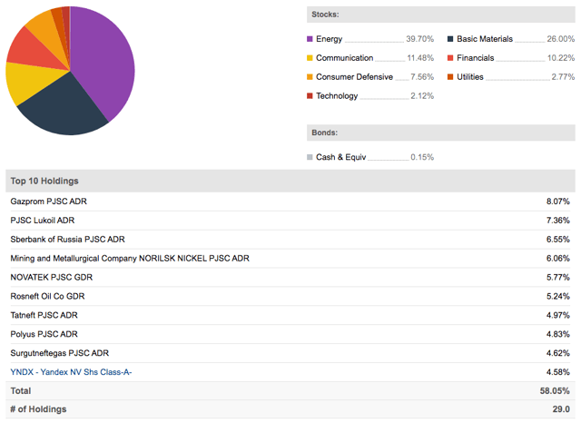 Si l’on examine la structure de l’ETF, seuls deux des dix principaux holdings sont relativement à l’abri de la chute de l’économie mondiale et locale : Polyus (OTCPK:OPYGY), la plus grande société d’extraction d’or en Russie, et Surgutneftegas (OTCPK:SGTPY), qui a des dizaines de milliards de dollars en espèces dans son bilan. La sous-performance du reste des participations de RSX, principalement des sociétés d’exploitation et de gaz, entraînera inévitablement RSX vers de nouveaux creux au cours des prochains trimestres.