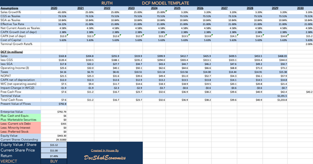 Compte tenu de ces hypothèses et du coût moyen pondéré actuel du capital de 5,63 % de Ruth, la juste valeur de l’entreprise serait de 15,12 $. Cela représente un gain de 37,49% par rapport aux niveaux actuels.