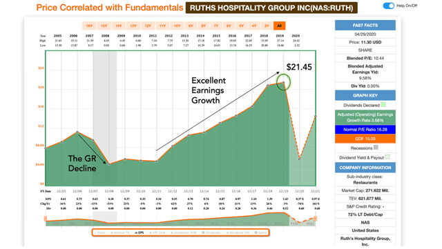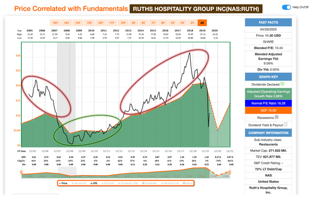 En partant de la gauche, on peut voir que pendant la période précédant et pendant la Grande Récession, les revenus de Ruth ont souffert. Ruth est passée d’un revenu de 75 cents par action à 30 cents par action. Pendant quelques années, les bénéfices de l’entreprise ont stagné, puis à partir de 2012, ils ont connu une fantastique ascension. Fin 2019, avant que COVID-19 n’arrive aux États-Unis, Ruth’s gagnait 1,43 $ par action et avait une juste valeur de 21,45 $ (sur la base d’un P/E de 15).