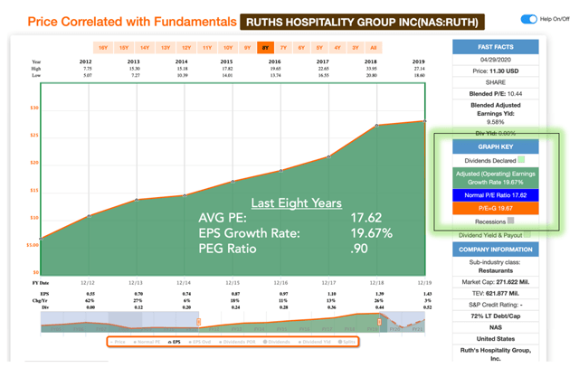 Maintenant, je vais raccourcir le délai pour examiner les huit dernières années de performance de la société. Au cours de cette période, le BPA de Ruth a augmenté de près de 20 % par an. C’est un taux de rendement énorme, celui qu’un investisseur pourrait attendre d’une entreprise en croissance.