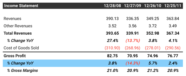 Pour mettre une récession en perspective, nous pouvons utiliser La Grande Récession comme étude de cas. D’après les données, nous pouvons constater qu’en 2009 (après que la récession se soit installée), le bénéfice brut de Ruth a chuté de 14,3 %. Pour mettre les choses en perspective, les Darden Restaurants (DRI) ont vu leur bénéfice brut augmenter de 6,2 %, The Cheesecake Factory (CAKE) de 3,4 % et Texas Roadhouse (TXRH) de 9,4 % en 2009.