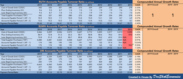 Ruth’s gagne dans les deux catégories ici. Son ratio de 2019 est le plus élevé, ce qui indique qu’elle rembourse les fournisseurs le plus rapidement, et implique qu’il n’y a pas de problèmes de liquidité immédiats. Au cours des dix dernières années, Ruth’s a été constante et bien meilleure que ses concurrents. Bloomin’ est la plus lente à rembourser les fournisseurs. En outre, Bloomin’ prend, en moyenne, plus de 7 % de temps supplémentaire par an pour rembourser les fournisseurs.