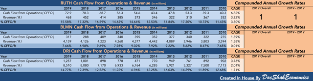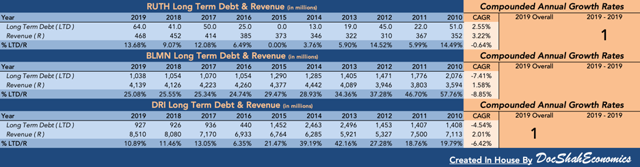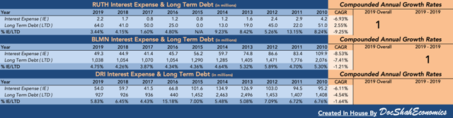 Dans l’ensemble, cependant, nous pouvons constater que la direction de Ruth a été la plus disciplinée (et de loin) dans la prise en charge de l’effet de levier. Lorsque les taux d’intérêt sont bas, l’emprunt devient incroyablement bon marché. De nombreuses entreprises s’endettent de manière excessive, même si elles n’en ont pas besoin. Je cherche des entreprises qui sont disciplinées et qui ne s’endettent que pour se développer. Ruth’s a fait un excellent travail dans ce sens au cours de la dernière décennie. Bloomin’ Brands a été (et est) extrêmement endettée – beaucoup trop à mon goût. Ruth’s remporte cette catégorie.