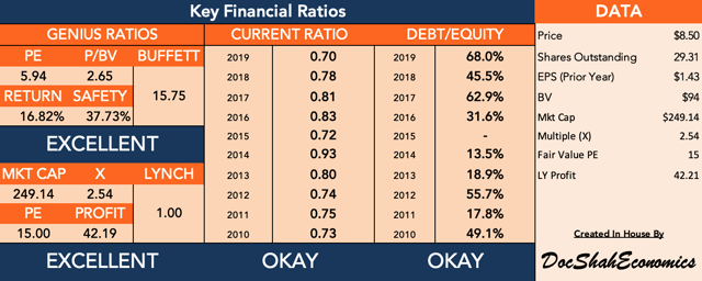 Le rapport prix/livre de Ruth est de 2,65 $. Cela signifie que si vous achetiez l’ensemble de l’entreprise aujourd’hui et que vous liquidiez immédiatement tous les actifs et remboursiez toutes les dettes, vous récupéreriez 37,73 % de votre argent (n’oubliez pas que la valeur marchande des actifs peut être inférieure à la valeur comptable). Dans tous les cas, il s’agit d’une marge de sécurité élevée. Par conséquent, Ruth’s offre un rendement élevé avec une marge de sécurité élevée (faible risque) du point de vue de la valeur comptable.