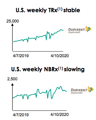 - Les tendances à la double prescription ont résisté, car « l’administration à domicile et l’absence d’exigence de contrôle en laboratoire sont clairement un avantage dans la situation actuelle ». En outre, « environ 80 % des dermatologues sont extrêmement à l’aise pour continuer à prescrire le traitement Dupixent par télémédecine et nous ne constatons aucun changement dans la durée de la prescription ». TRx séquentiel en hausse de +19% QoQ, (croissance des ventes +12% QoQ). Les États-Unis représentent actuellement 79 % des ventes.