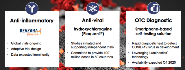 Comme beaucoup d’autres sociétés biopharmaceutiques, Sanofi travaille sur des solutions contre le virus. En termes de traitements à court terme, la société a des essais en cours pour l’anti-inflammatoire Kevzara (sarilumab) ainsi que pour l’anti-viral Plaquenil (hydroxychloroquine). La société s’est engagée à fournir 100 millions de doses de ce dernier. Sanofi travaille également sur un test de diagnostic rapide pour COVID-19, basé sur un téléphone intelligent OTC Diagnostic, qui pourrait être disponible au quatrième trimestre 20.