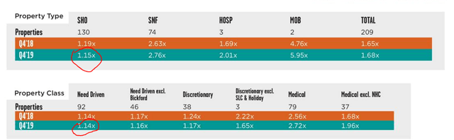 Ce chiffre est également calculé sur une base de 12 mois glissants, ce qui est probablement exagéré car les fondamentaux de 2019 se sont déjà détériorés. Avec les baisses actuelles du taux d’occupation et l’augmentation des coûts, nous nous attendons à ce que l’ensemble du portefeuille de logements pour personnes âgées soit inférieur à 1,0X. Cela représente 62% du portefeuille (130 sur 209 propriétés). Cela devrait se traduire par une baisse substantielle des loyers au cours des 12 prochains mois.