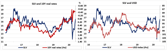 Comme pour l’or (NYSEARCA:GLD), les taux d’intérêt réels ont été l’un des principaux moteurs du SLV au fil du temps ; la figure 3 (cadre de gauche) montre que l’effondrement des taux d’intérêt réels américains sur 10 ans, qui sont passés de 1,20 à près de -0,50, a fait baisser le prix de la plupart des actifs non rémunérés comme l’or, l’argent ou même les bitcoins (BTC). Comme l’argent ne génère aucun flux de trésorerie et que les investisseurs ne bénéficient que de l’appréciation du capital, il est très sensible à la dynamique des taux d’intérêt réels. L’autre grand moteur est évidemment le dollar américain (NYSEARCA:UUP). En général, les produits de base ont de mauvais résultats lorsque le dollar se renforce fortement.