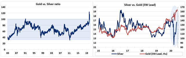 Selon certains analystes, l’argent reste extrêmement sous-évalué par rapport au prix de l’or et devrait donc continuer à s’apprécier à moyen terme, ce qui devrait ramener le ratio à son « équilibre » à long terme. La figure 5 (cadre de gauche) montre qu’en effet, le ratio or/argent est sorti de sa fourchette de LT 35-100 et a grimpé à plus de 120 pendant la divergence de mars ; cependant, nous soutenons que ce ratio deviendra moins pertinent à l’avenir et que nous pourrions avoir une période prolongée de vigueur de l’or tandis que l’argent reste stable, ce qui ferait monter le ratio dans une fourchette plus élevée.