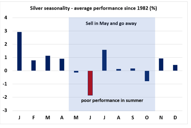 Historiquement, nous savons que la performance des actions est nettement plus faible pendant la période estivale de mai à octobre que pendant la période hivernale de novembre à avril. Dans un article récent, nous avons étendu l’adage d’investissement « vendre en mai et partir » à différentes classes d’actifs et avons trouvé des résultats intéressants pour l’argent. Contrairement à l’or et à d’autres valeurs sûres comme le yen japonais, l’argent a tendance à avoir de mauvais résultats pendant la période estivale. Dans la figure 2, nous calculons les rendements moyens de l’argent pour chaque mois de l’année depuis 1982 ; il est intéressant de noter que le mois le plus mauvais pour l’argent a toujours été le mois de juin, le métal précieux ayant chuté de près de 2 % en moyenne. Par conséquent, les investisseurs haussiers peuvent vouloir éviter une éventuelle dépréciation en juin, surtout maintenant que le SLV est fortement « suracheté » selon le RSI.