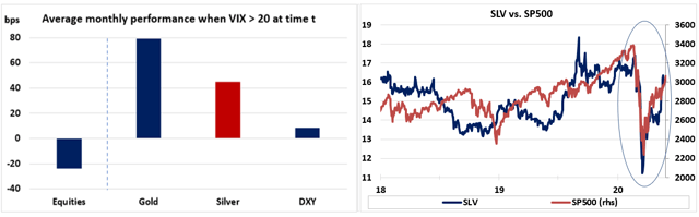 Sur le long terme, nous avons vu que l’argent tend à être une bonne protection contre la volatilité et qu’il augmente lorsque le VIX commence à monter en flèche. La figure 4 (cadre de gauche) montre qu’au cours des 30 dernières années (depuis la création du VIX), l’argent s’est comporté positivement lorsque le VIX s’échangeait au-dessus de 20, avec une moyenne de 45 pb. On est encore loin des 80 points de base pour l’or, mais il s’est avéré être un solide diversificateur en période de tensions sur le marché. Toutefois, nous pouvons remarquer qu’il a enregistré une performance terrible au premier trimestre 2020, avec une baisse de 21 %, et qu’il a parfaitement co-modéré avec les actions américaines (figure 4, cadre de droite). Nous savons que l’inertie – c’est-à-dire la façon dont un actif s’est comporté dans le passé – est une caractéristique forte lorsqu’on définit un actif « refuge », et l’argent peut donc être plus sensible à un mouvement à la baisse des actions à venir. La volatilité des prix a été comprimée dans toutes les catégories d’actifs, principalement en raison des interventions massives des banques centrales, mais l’incertitude (ou volatilité fondamentale) n’a cessé de croître au cours des deux derniers mois. Par conséquent, nous sommes convaincus que la divergence entre l’incertitude et la volatilité à moyen terme rend les actions américaines et internationales plus vulnérables à une légère baisse de 10 à 15 % et pourrait à nouveau avoir un impact significatif sur le prix de l’argent.