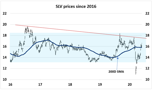 Les prix de l’argent (NYSEARCA:SLV) ont considérablement augmenté au cours des deux derniers mois, en hausse de plus de 50 % par rapport à leur plus bas niveau de mars et se rapprochant lentement du plus haut de leur fourchette de cinq ans (13,5-18,5). En outre, le SLV s’est également négocié au-dessus de sa moyenne mobile simple (SMA) de 200 jours, ce qui rassure les investisseurs sur le fait que nous pourrions assister au début d’une reprise à long terme. Dans cet article, nous soutenons que même si nous restons optimistes sur SLV à long terme, nous pensons que l’argent semble assez vulnérable à court terme et nous nous attendons à une légère consolidation dans les semaines à venir.
