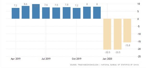 En mars 2020, le commerce de détail chinois a diminué de 15,8 % en glissement annuel, après une chute de 20,5 % en janvier-février. La dernière lecture a été pire que les prévisions du marché, qui annonçaient une chute de 10 %, dans un contexte d’épidémie de coronavirus, les gens ayant toujours peur d’aller dans des endroits bondés comme les centres commerciaux, les restaurants et les cinémas.