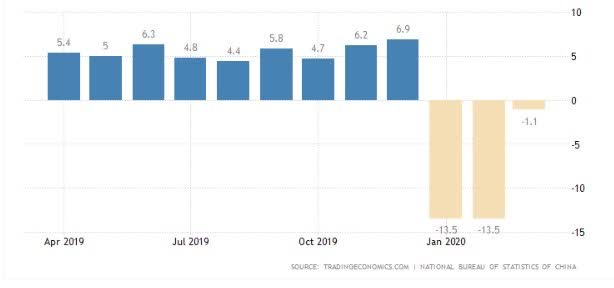La production industrielle chinoise a chuté de 1,1 % en mars 2020, en glissement annuel, après une chute de 13,5 % en janvier-février et par rapport aux attentes du marché, qui prévoyait une baisse de 7,3 %, dans un contexte de reprise partielle de l’économie suite aux restrictions des activités commerciales et des déplacements dues à l’épidémie de COVID-19.