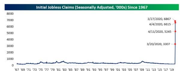 La semaine dernière, les demandes corrigées des variations saisonnières se sont élevées à 6,61 millions, ce qui fait de la baisse de 1,37 million à 5,245 millions cette semaine la plus forte baisse jamais enregistrée. C’est une petite consolation étant donné qu’il s’agissait encore de la troisième plus grande lecture hebdomadaire enregistrée.