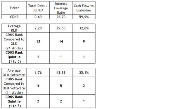 En ce qui concerne la santé financière, le profil d’endettement de Cadence se situe dans le premier ou le deuxième quintile dans les deux groupes, car l’entreprise a réussi à réduire son ratio dette/EBTIDA en dessous de 0,7 au cours des deux dernières années