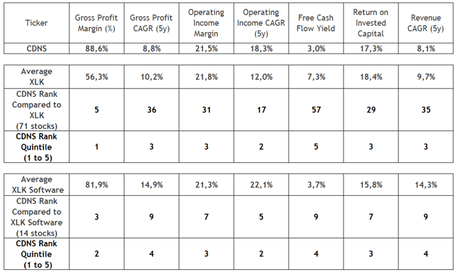 Premièrement, si l’on regarde la rentabilité, la marge bénéficiaire brute de Cadence figure parmi les trois premières sociétés du groupe de logiciels, seulement derrière Autodesk (ADSK) et son homologue Synopsys. En outre, sa marge d’exploitation se situe au milieu de celle de ses deux pairs, tandis que son taux de croissance au cours des 5 dernières années se situe dans les 2nd quintile.